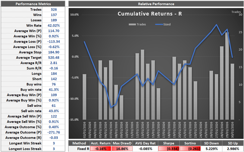 Trading activity on the day was lighter than usual, with a lower trigger rate reflecting the heightened event risk and uneven follow-through. The standout performance came from Oil, which reached its upside target and delivered a 3.04R return. Elsewhere, smaller gains were recorded across EURCHF, Copper, XRP, and Bitcoin, while modest losses were incurred in Ethereum and Litecoin. Overall, January’s NFP session reinforced the importance of patience around macro releases, as initial reactions gave way to more nuanced price behaviour across asset classes.