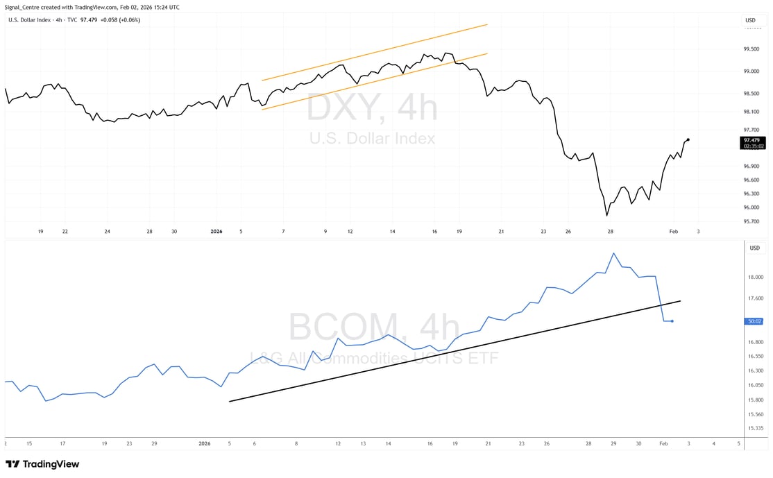 The black line represents the DXY, which began the year with bullish momentum, trading higher within a well-defined rising channel. That structure broke down abruptly around 19 January 2026, triggering a sharp sell-off and a rapid shift in dollar dynamics. The sudden reversal created a difficult trading environment for FX majors, with reduced follow-through and heightened volatility contributing to weaker performance across the complex.