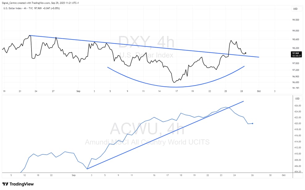 The chart below (Black line) shows the Dollar Index (DXY), which continued its downward momentum at the start of September. A bottoming formation developed mid-month, and once completed, it provided a strong technical backdrop that supported further gains. Our analysts were able to capitalise on this setup, generating positive performance across both FX Majors and FX Crosses.